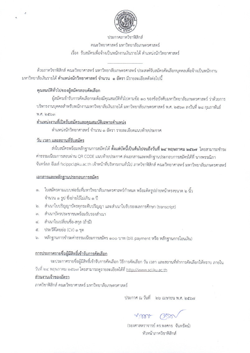 เขียนโดย admin เมื่อ พฤ, 02/05/2024 - 11:34 รายละเอียดเพิ่มเติมและเอกสารการสมัคร >>> https://www.sci.ku.ac.th/web2019/supplies/13612-2/