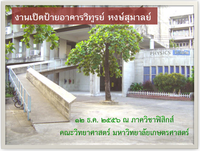 ขอเชิญร่วมงานเปิดป้ายอาคารวิฑูรย์ หงษ์สุมาลย์ (ตึกฟิสิกส์เดิม) ในวันที่ 12 ธันวาคม 2556